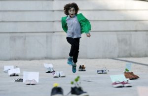 De toutes tailles, genres et couleurs, chaque paire de chaussures, baskets, sandales ou bottes représentait une personne et portait, à l'intérieur, une fleur et un