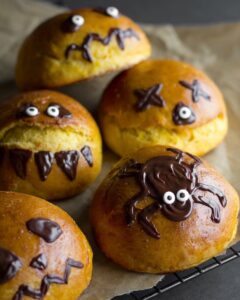 Préparez ces délicieux et savoureux petits pains à la citrouille d’Halloween faits maison ! Garnissez de dessins effrayants en chocolat et servez !