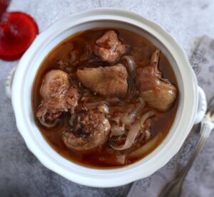 Qui n’aime pas le ragoût, surtout pendant les froides journées d’hiver. Ce délicieux ragoût de poulet arrosé de vin rouge et parfumé au romarin est