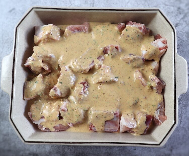 – Côtes de porc, jus de citron, ail, romarin, huile d’olive, moutarde de Dijon
