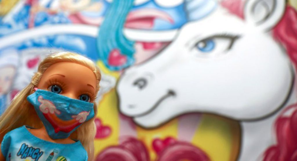 «Poupées Nancy portant des masques de protection»; des poupées livrées avec un testeur de virus, un masque et des kits de fabrication de savon seraient achetées avec enthousiasme par des parents portugais et espagnols.