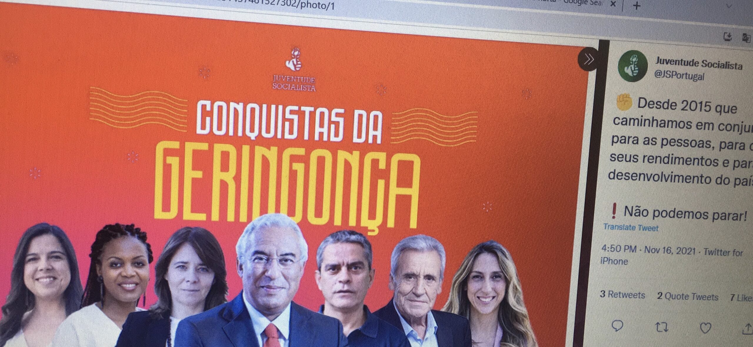 Quelques minutes après la publication, A Juventude Socialista a supprimé un tweet dans lequel elle rassemblait dans un montage photo la porte-parole du PAN, Inês de Sousa Real, et les députés non inscrits Cristina Rodrigues et Joacine Katar Moreira aux dirigeants du PS, Bloco de Esquerda, PCP et PEV, sous le titre « Conquêtes de l’engin ». Quelques heures plus tard, en fin d’après-midi de mardi, la publication a été remplacée, mais cette fois sans que le slogan « Conquistas da Geringonça » soit accompagné de l’image d’un quelconque homme politique.