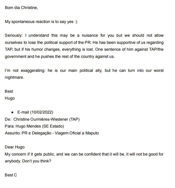 L’ancien secrétaire d’État aux Infrastructures Hugo Mendes aurait demandé à la PDG sortante de la TAP, Christine Ourmières-Widener, de reporter un vol en provenance du Mozambique, qui avait comme passager le président de la République. Apparemment, Marcelo Rebelo de Sousa devait rester deux jours de plus à Maputo.
