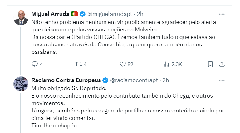 « Je n’ai aucun problème à vous remercier publiquement pour l’avertissement que vous avez laissé et pour vos actions à Malveira. De notre côté (Partido Chega), nous avons également fait tout ce que nous pouvions à travers le conseil, que je tiens également à féliciter », a écrit, sur le réseau social X (anciennement Twitter), le député du parti populiste radical, en réponse à une publication de Mário Machado sur le sujet. Miguel Arruda, élu par le cercle des électeurs, indique également que la municipalité de Mafra do Chega « a fait tout son possible » pour que tel soit le résultat.