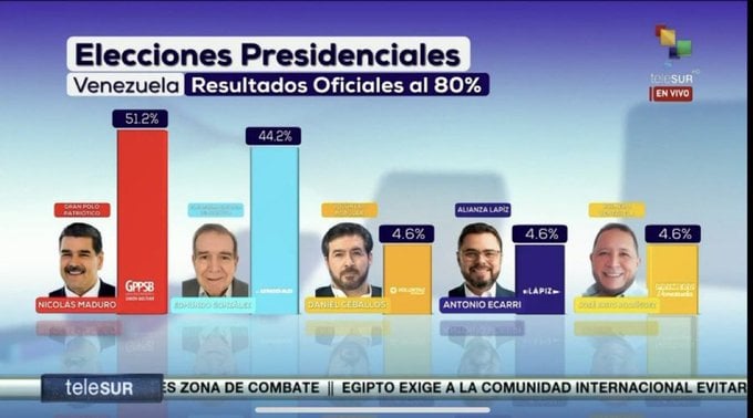 Les chiffres officiels montrent que Maduro a obtenu 5,15 millions de voix, devant le candidat de l’opposition Gonzalez Urrutia, qui a obtenu un peu moins de 4,5 millions (44,2%).