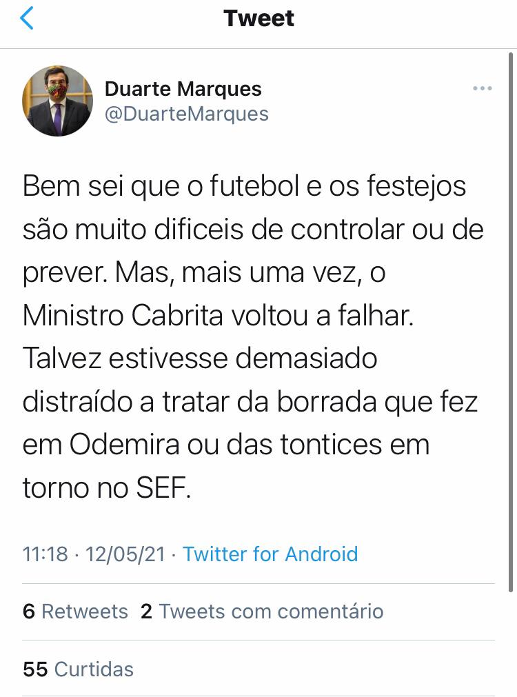 Ce matin, le député PSD Duarte Marques, l’un des plus grands critiques de l’action de l’Administration interne ces dernières années, a signalé des batteries au ministre Eduardo Cabrita, qui a été sous pression en raison de l’intervention à Odemira, pour contenir la pandémie avec la communauté. travailleurs migrants.