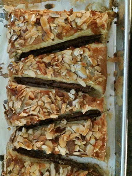 4. À l’aide d’un couteau bien aiguisé, faire des coupes, environ tous les 4 pouces, en diagonale en zigzag, d’un côté à l’autre, pour former des triangles comme indiqué sur la photo. Répartir généreusement les amandes effilées sur le blanc d’œuf mouillé. Cuire le four préchauffé jusqu’à ce qu’il soit doré, environ 35 à 40 minutes.